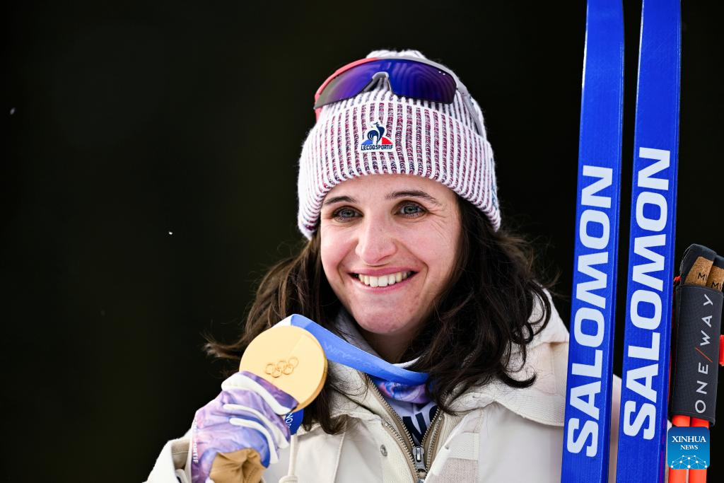 Gold medalist Julia Simon of France poses for a photo during the awarding ceremony of the biathlon women's 15km individual match at the Milan-Cortina 2026 Olympic Winter Games in Anterselva, Italy, Feb. 11, 2026. (Xinhua/Zhang Tao)