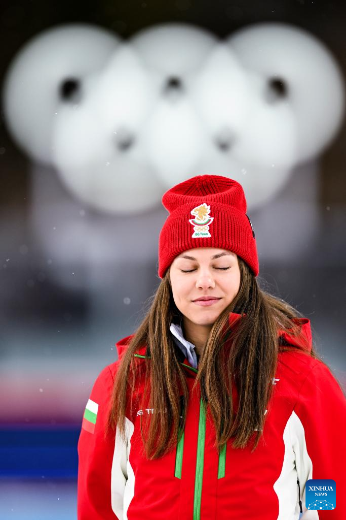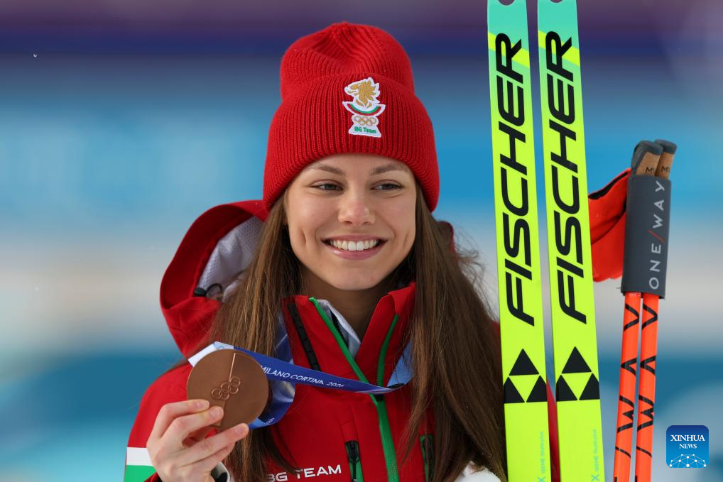 Bronze medalist Lora Hristova of Bulgaria poses for a photo during the awarding ceremony of the biathlon women's 15km individual match at the Milan-Cortina 2026 Olympic Winter Games in Anterselva, Italy, Feb. 11, 2026. (Xinhua/Zhang Tao)