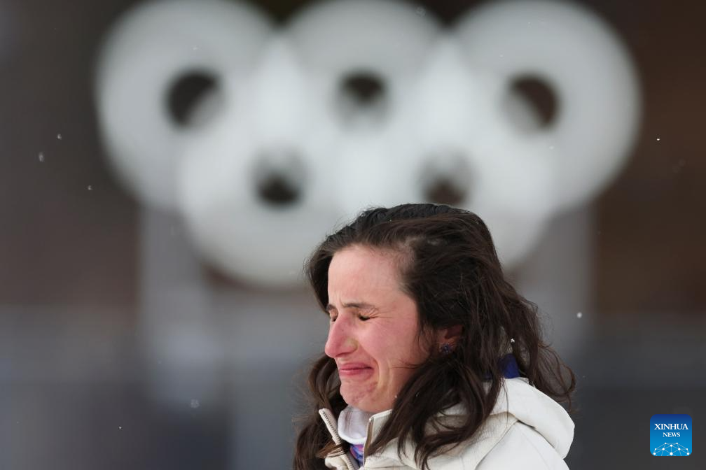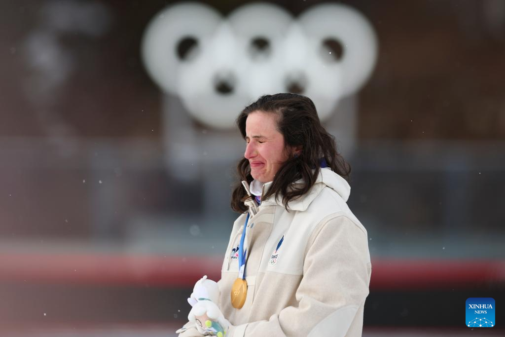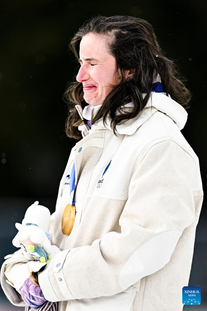 Gold medalist Julia Simon of France weeps during the awarding ceremony of the biathlon women's 15km individual match at the Milan-Cortina 2026 Olympic Winter Games in Anterselva, Italy, Feb. 11, 2026. (Xinhua/Zhang Tao)
