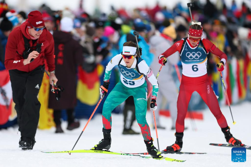 Lora Hristova (front) of Bulgaria competes during the biathlon women's 15km individual match at the Milan-Cortina 2026 Olympic Winter Games in Anterselva, Italy, Feb. 11, 2026. (Xinhua/Zhang Tao)