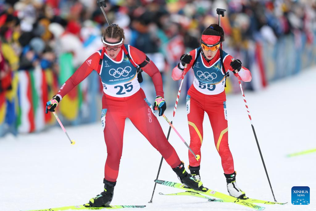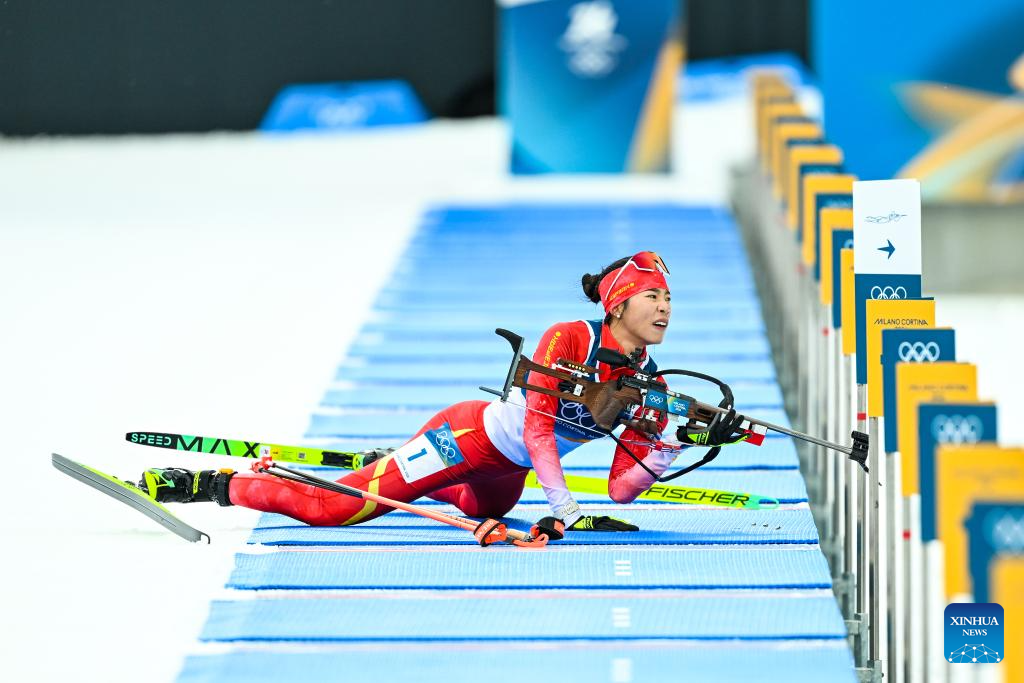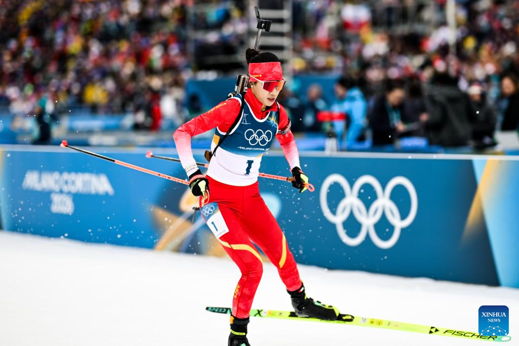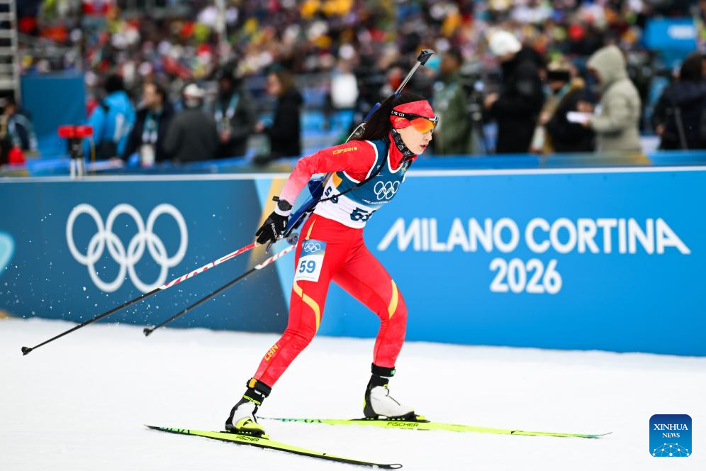 Meng Fanqi of China passes the finish line during the biathlon women's 15km individual match at the Milan-Cortina 2026 Olympic Winter Games in Anterselva, Italy, Feb. 11, 2026. (Xinhua/Jiang Han)