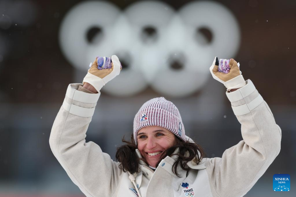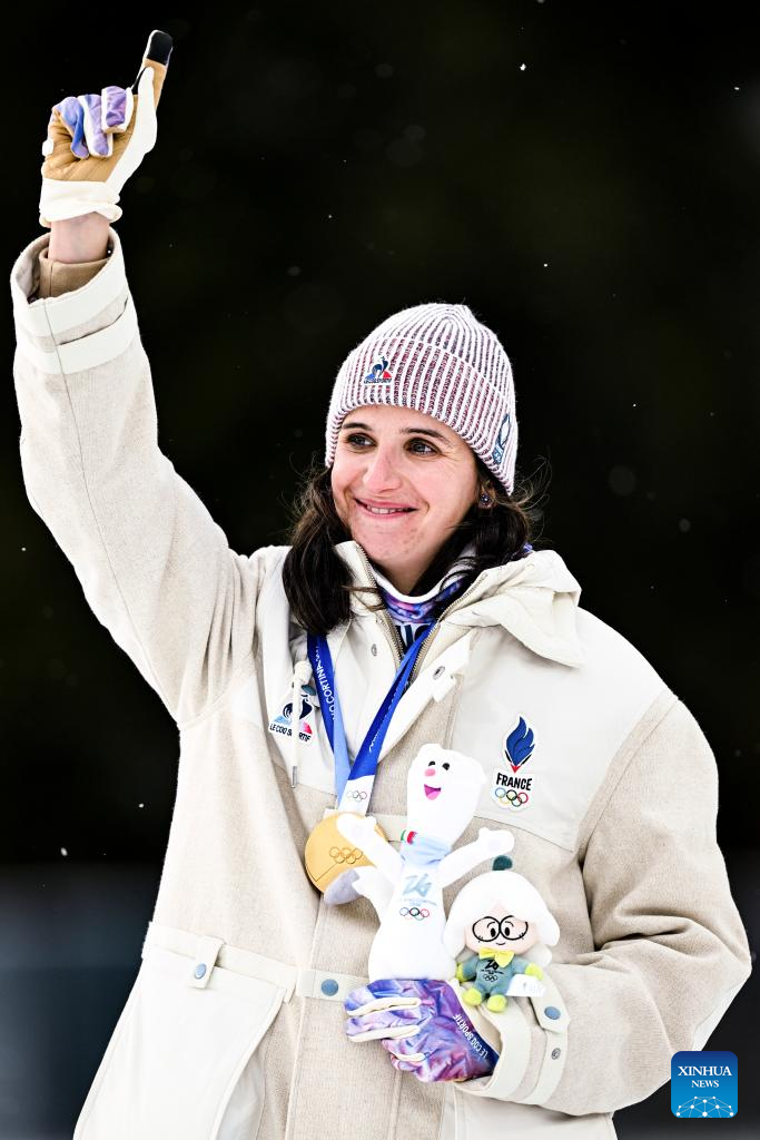 Gold medalist Julia Simon of France celebrates during the awarding ceremony of the biathlon women's 15km individual match at the Milan-Cortina 2026 Olympic Winter Games in Anterselva, Italy, Feb. 11, 2026. (Xinhua/Zhang Tao)