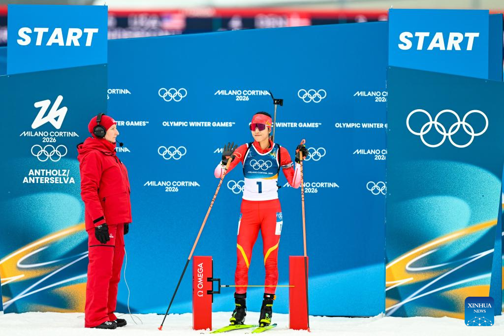 Chu Yuanmeng of China is ready to depart during the biathlon women's 15km individual match at the Milan-Cortina 2026 Olympic Winter Games in Anterselva, Italy, Feb. 11, 2026. (Xinhua/Jiang Han)