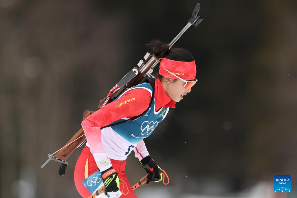 Meng Fanqi of China competes during the biathlon women's 15km individual match at the Milan-Cortina 2026 Olympic Winter Games in Anterselva, Italy, Feb. 11, 2026. (Xinhua/Zhang Tao)