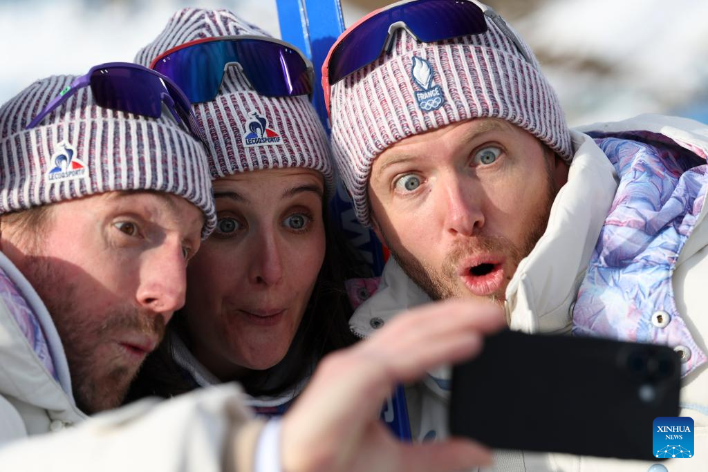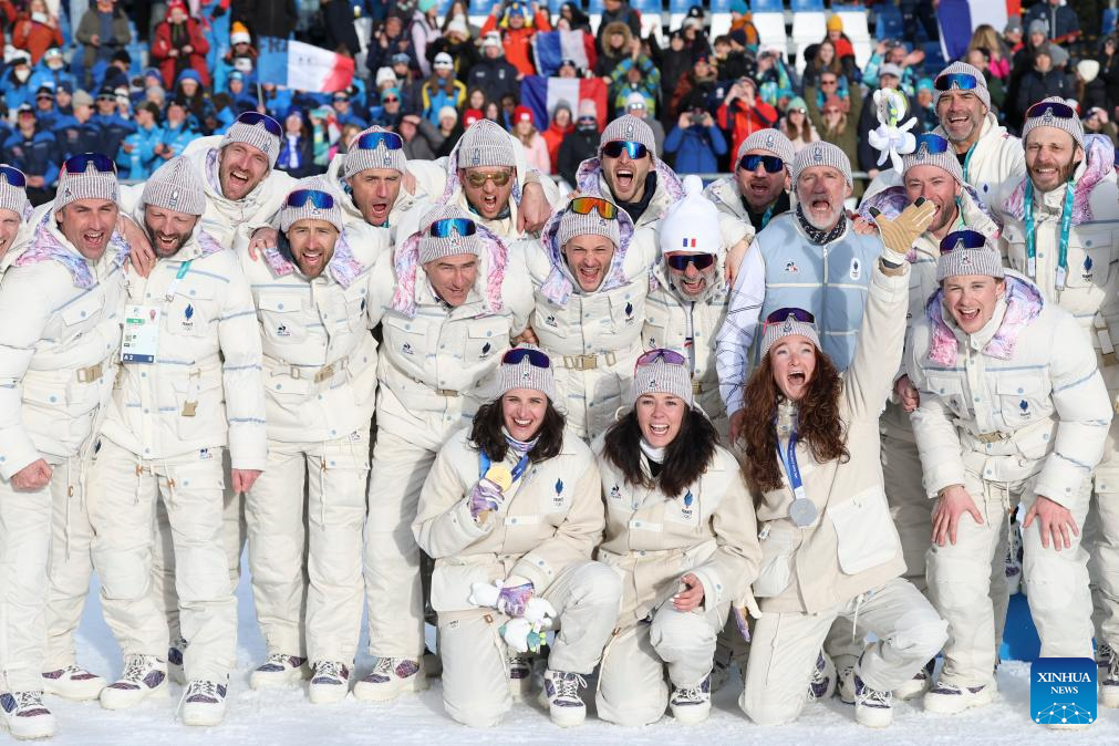 Members of France pose for a photo after the awarding ceremony of the biathlon women's 15km individual match at the Milan-Cortina 2026 Olympic Winter Games in Anterselva, Italy, Feb. 11, 2026. (Xinhua/Zhang Tao)