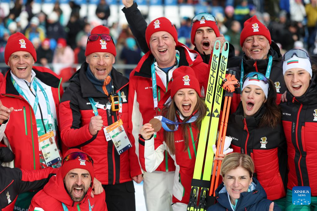 Members of Bulgaria pose for a photo after the awarding ceremony of the biathlon women's 15km individual match at the Milan-Cortina 2026 Olympic Winter Games in Anterselva, Italy, Feb. 11, 2026. (Xinhua/Zhang Tao)
