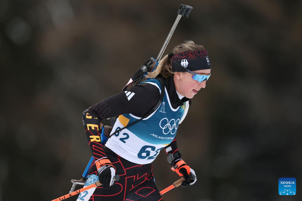 Franziska Preuss of Germany competes during the biathlon women's 15km individual match at the Milan-Cortina 2026 Olympic Winter Games in Anterselva, Italy, Feb. 11, 2026. (Xinhua/Zhang Tao)