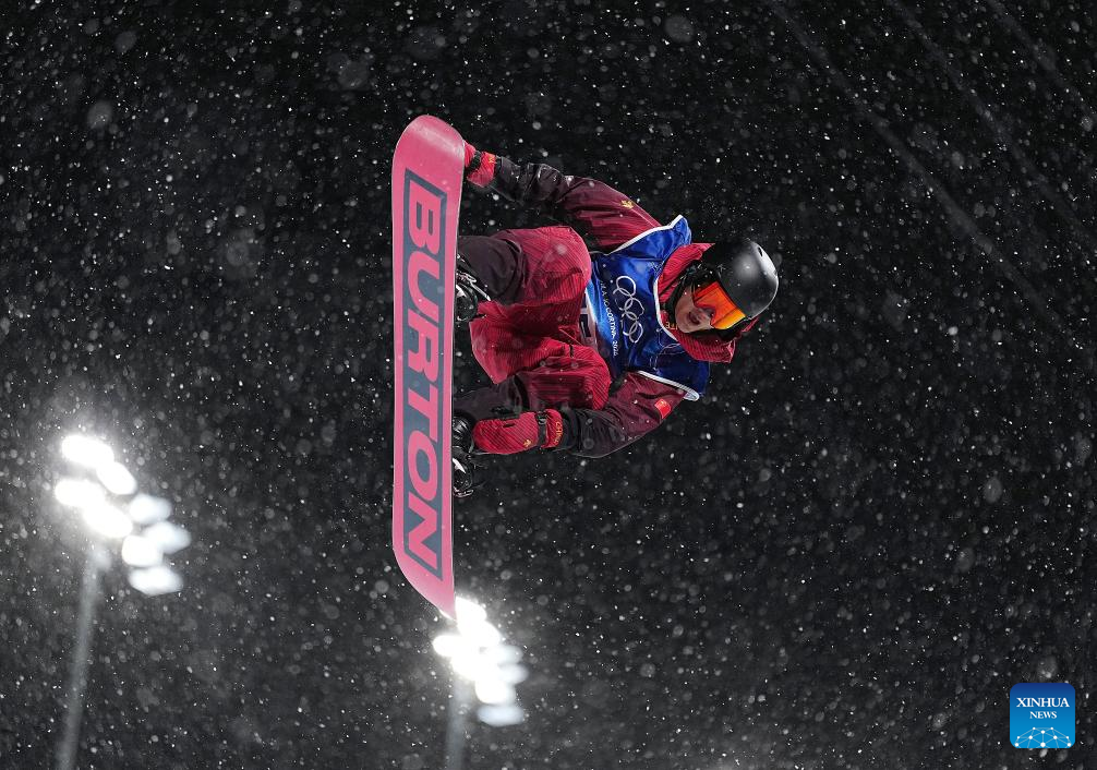 Wang Ziyang of China practices before the men's snowboard halfpipe qualification at the Milan-Cortina 2026 Olympic Winter Games in Livigno, Italy, Feb. 11, 2026. (Xinhua/Wu Huiwo)