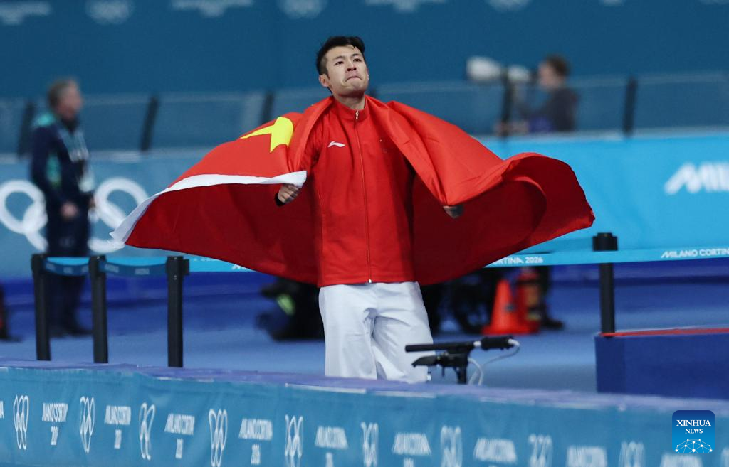 Ning Zhongyan of China celebrates after the speed skating men's 1000m match at the Milan-Cortina 2026 Olympic Winter Games in Milan, Italy, Feb. 11, 2026. (Xinhua/Li Jing)