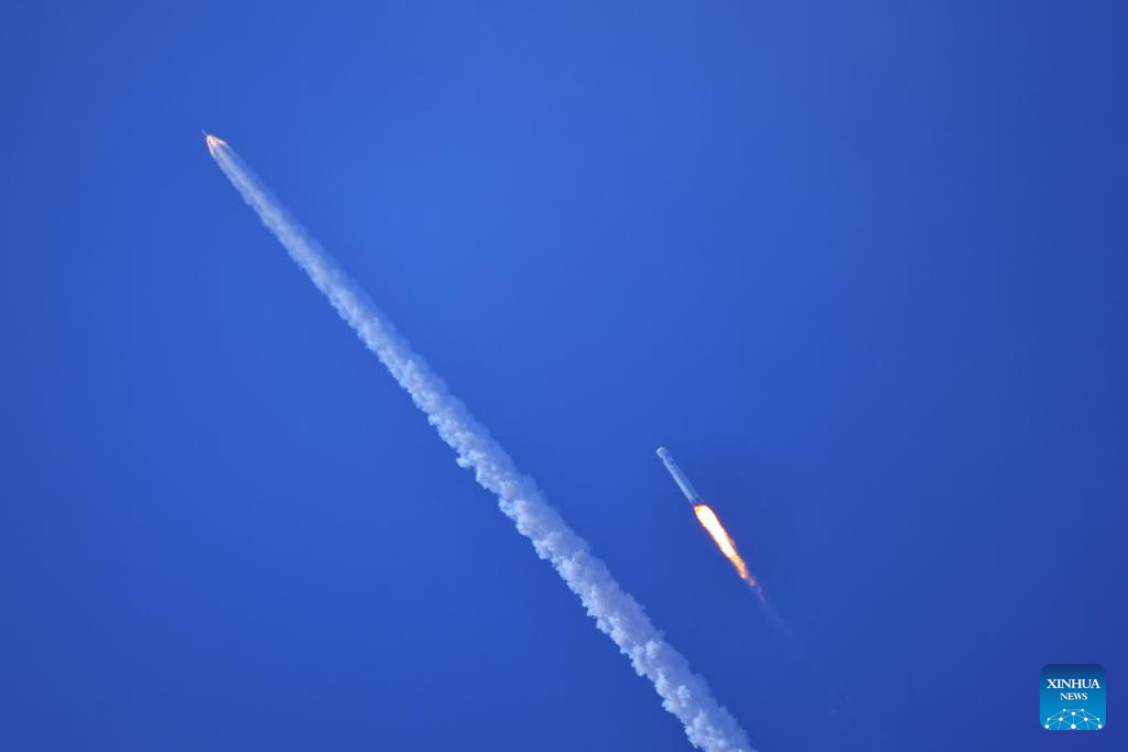 A low-altitude demonstration and verification flight test for the Long March-10 carrier rocket and a maximum dynamic pressure abort flight test for the new-generation crewed spaceship system Mengzhou are successfully conducted at the Wenchang Spacecraft Launch Site in south China's Hainan Province on Wednesday. (Xinhua/Yang Guanyu)