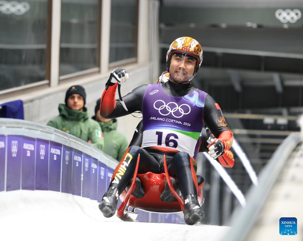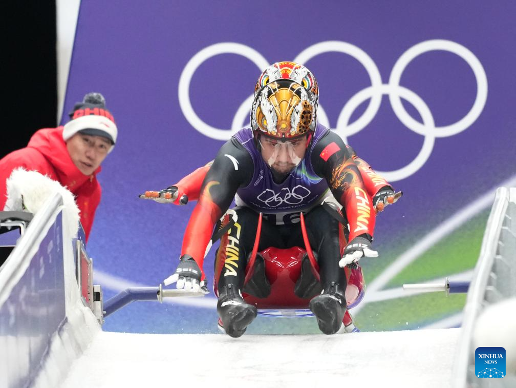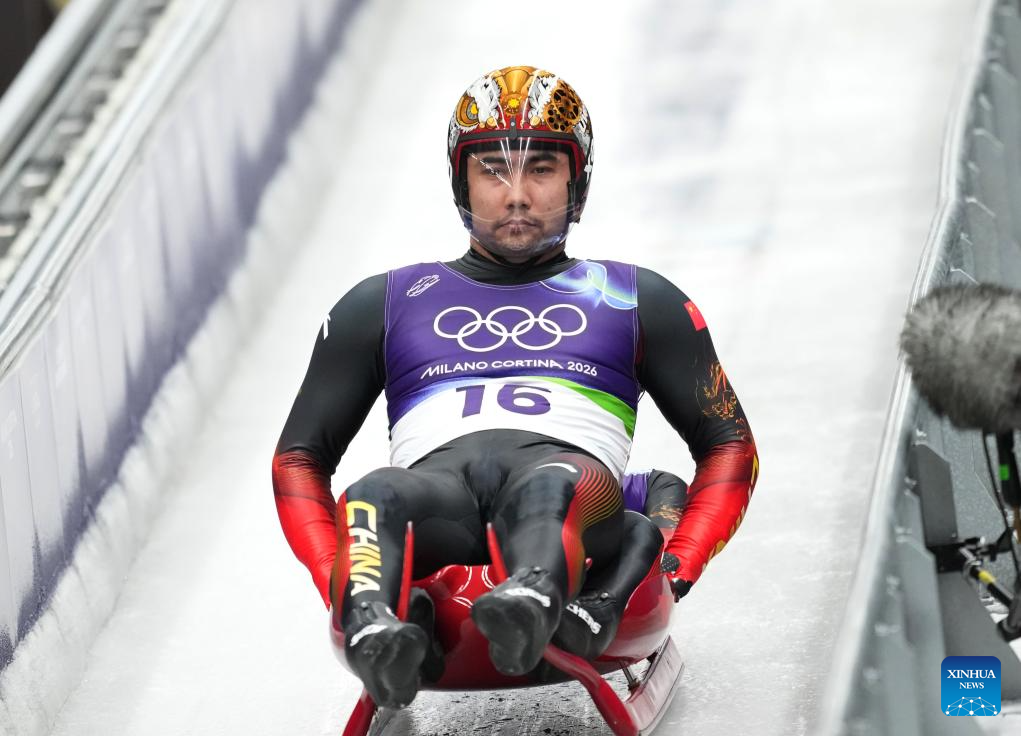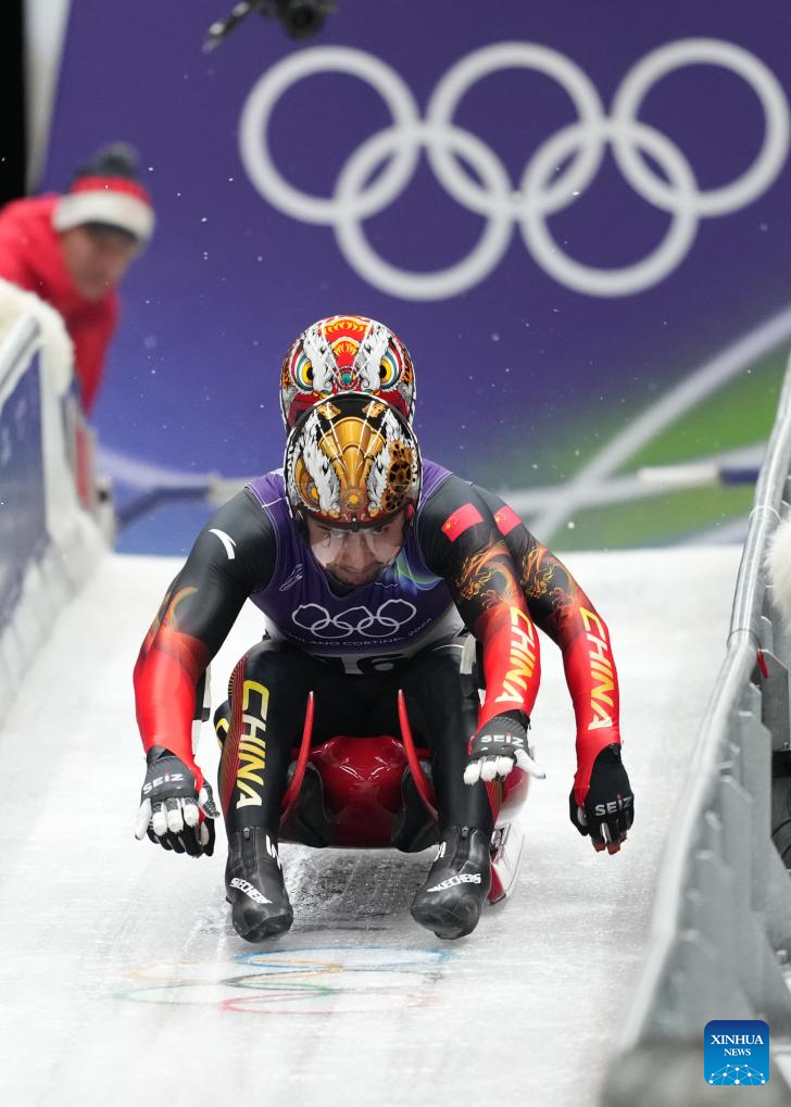 Jubayi Saikeyi (front)/Hou Shuo of China compete during the luge men's doubles run 1 at the Milan-Cortina 2026 Olympic Winter Games in Cortina, Italy, Feb. 11, 2026. (Xinhua/Li Gang)