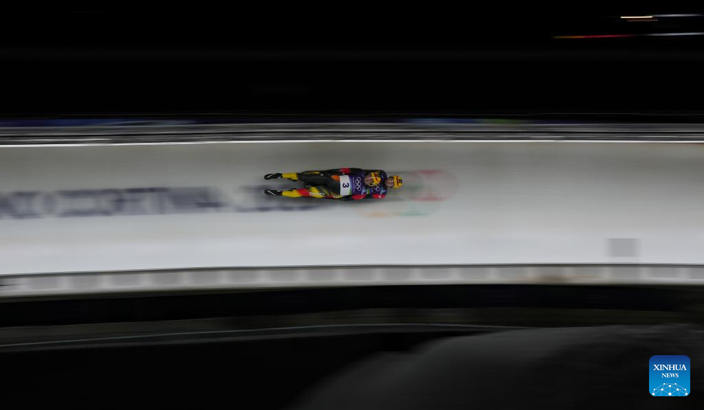 Tobias Wendl/Tobias Arlt of Germany compete during of the luge men's doubles run 1 at the Milan-Cortina 2026 Olympic Winter Games in Cortina, Italy, Feb. 11, 2026. (Xinhua/Li Gang)