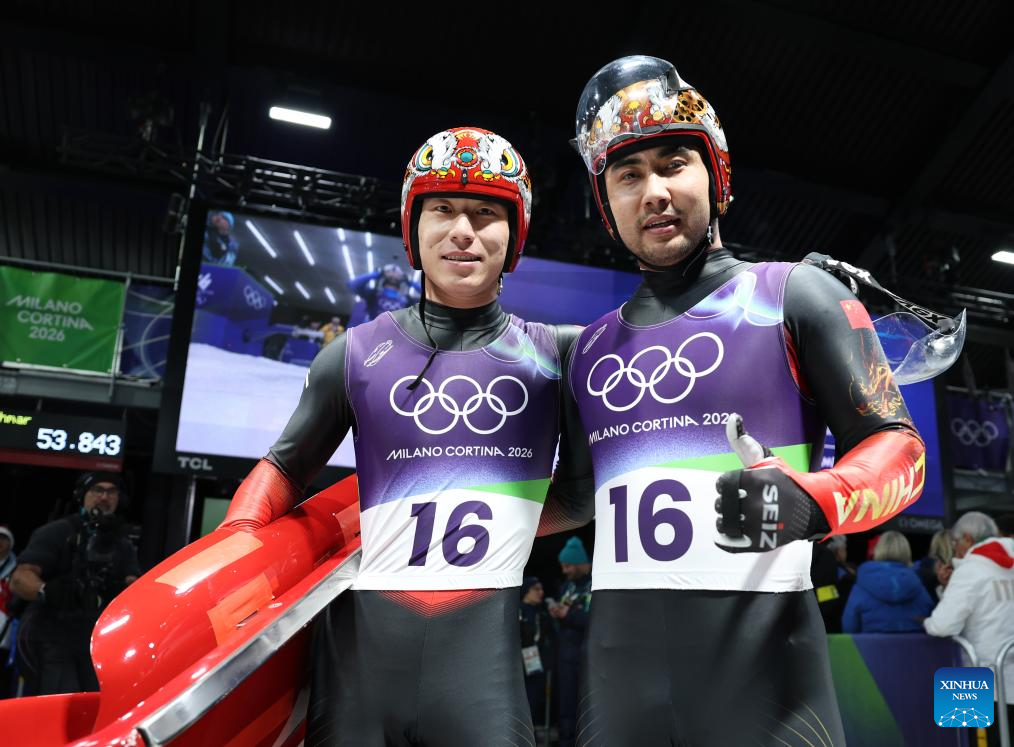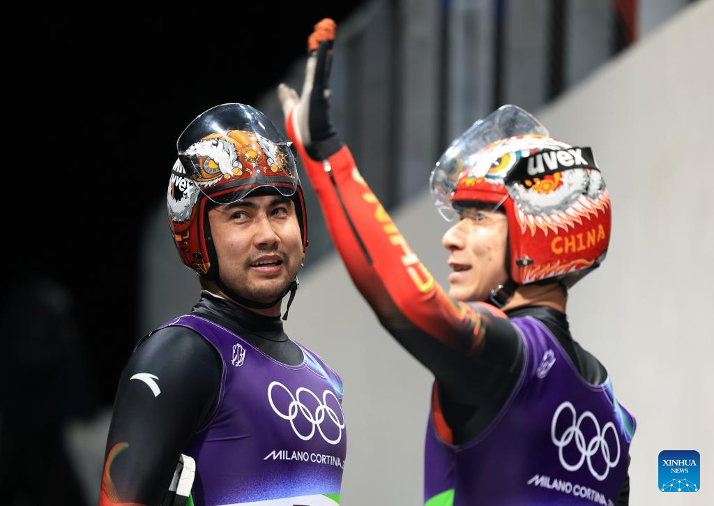 Jubayi Saikeyi/Hou Shuo of China celebrate after of the luge men's doubles match at the Milan-Cortina 2026 Olympic Winter Games in Cortina, Italy, Feb. 11, 2026. (Xinhua/Ding Xu)