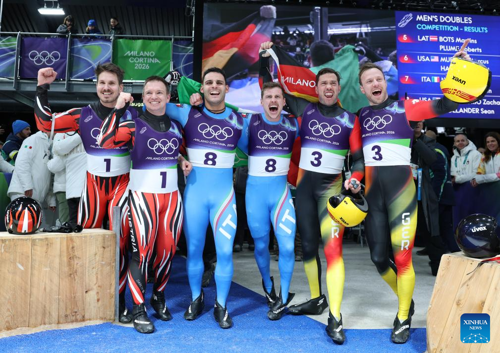 Gold medalists Emanuel Rieder/Simon Kainzwaldner (C) of Italy, silver medalists Thomas Steu/Wolfgang Kindl (L) of Austria, and bronze medalists Tobias Wendl/Tobias Arlt of Germany celebrate after of the luge men's doubles at the Milan-Cortina 2026 Olympic Winter Games in Cortina, Italy, Feb. 11, 2026. (Xinhua/Ding Xu)