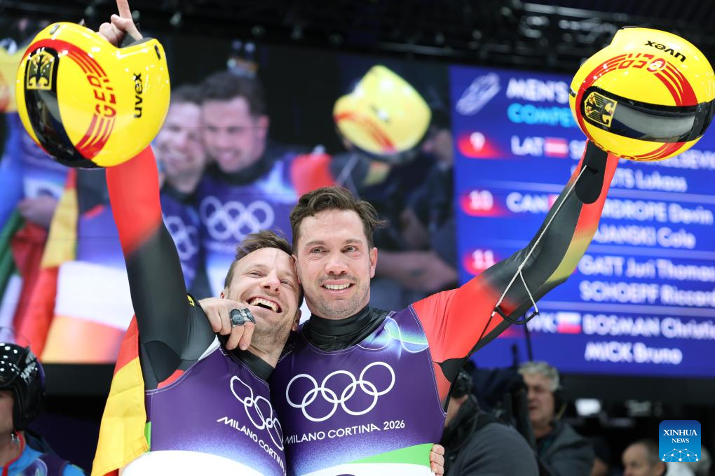 Tobias Wendl/Tobias Arlt of Germany celebrate after of the luge men's doubles match at the Milan-Cortina 2026 Olympic Winter Games in Cortina, Italy, Feb. 11, 2026. (Xinhua/Ding Xu)