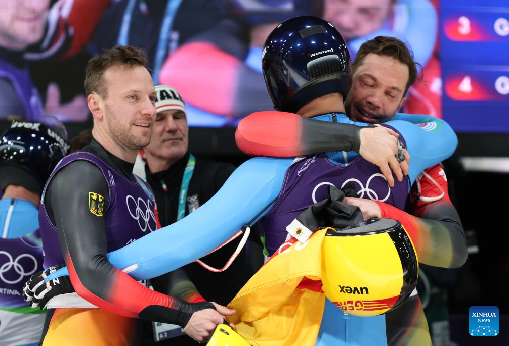 Gold medalists Emanuel Rieder/Simon Kainzwaldner interact with bronze medalists Tobias Wendl/Tobias Arlt of Germany after of the luge men's doubles match at the Milan-Cortina 2026 Olympic Winter Games in Cortina, Italy, Feb. 11, 2026. (Xinhua/Ding Xu)