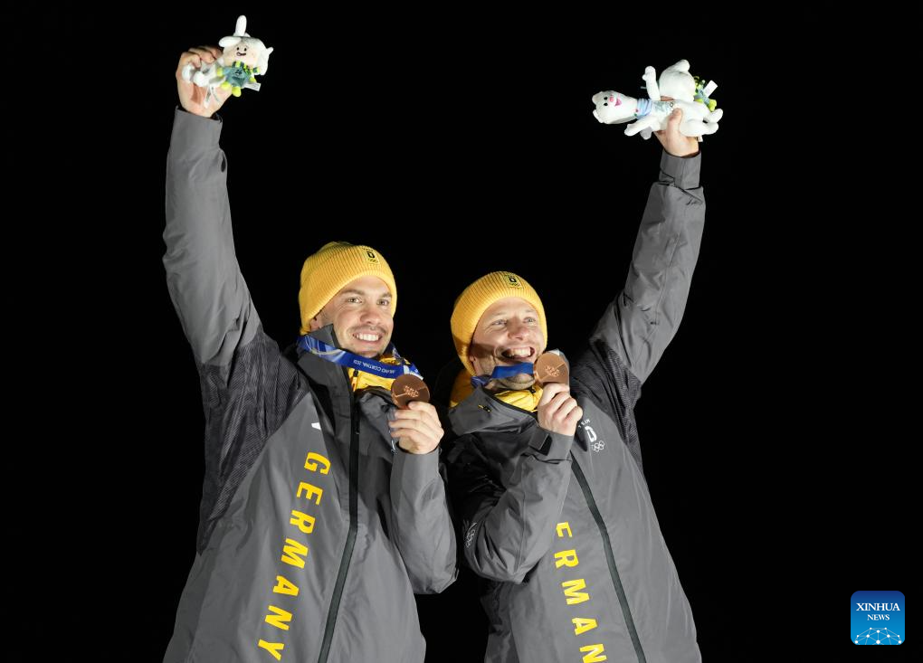 Bronze medalists Tobias Wendl/Tobias Arlt of Germany pose for a photo during the awarding ceremony of the luge men's doubles at the Milan-Cortina 2026 Olympic Winter Games in Cortina, Italy, Feb. 11, 2026. (Xinhua/Li Gang)
