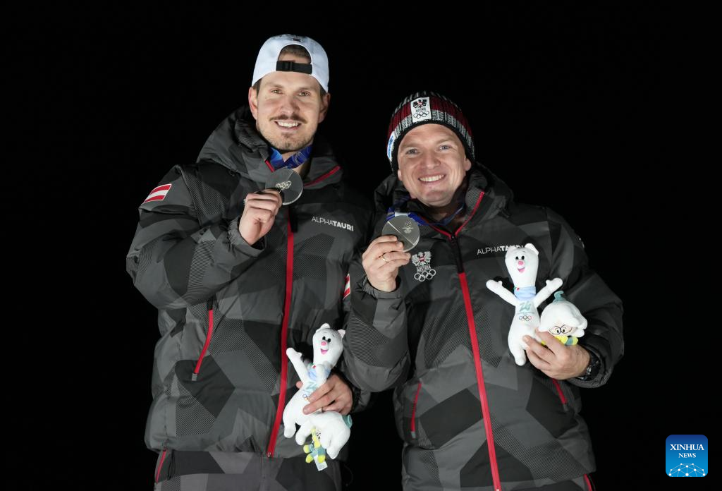 Silver medalists Thomas Steu/Wolfgang Kindl of Austria pose for a photo during the awarding ceremony of the luge men's doubles at the Milan-Cortina 2026 Olympic Winter Games in Cortina, Italy, Feb. 11, 2026. (Xinhua/Li Gang)