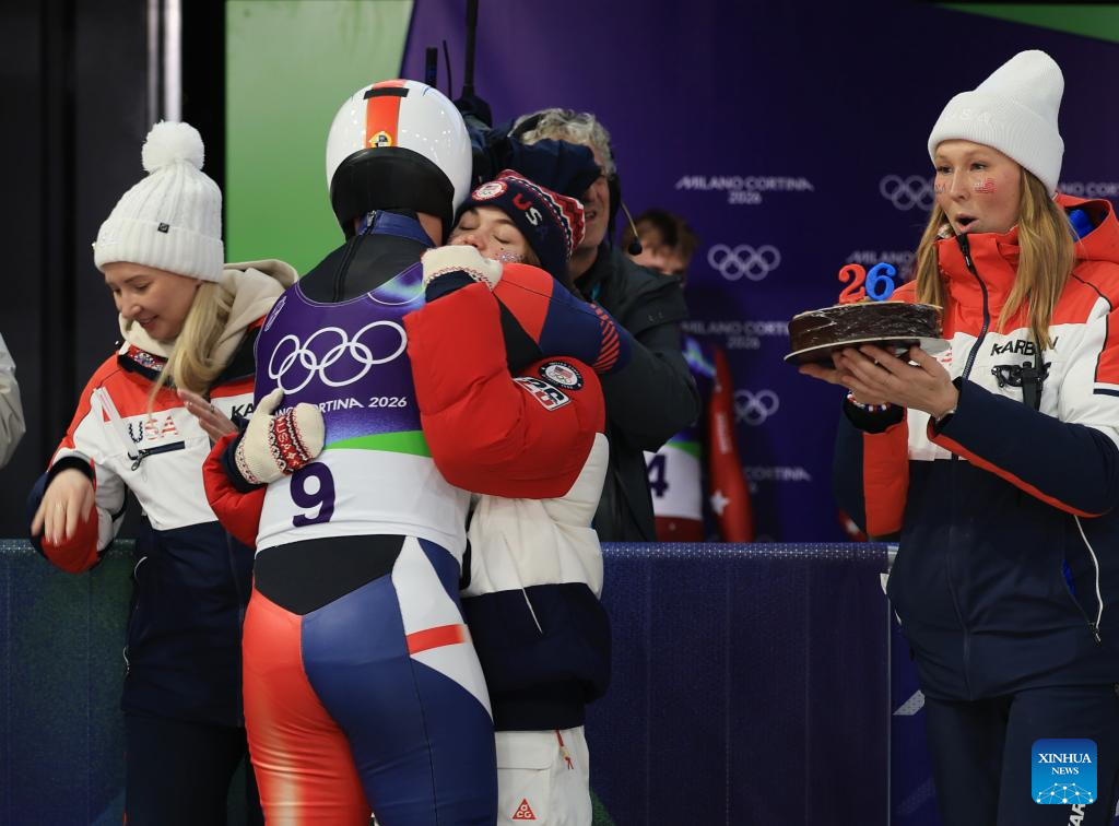 Members of the team USA celebrate birthday for a player after of the luge men's doubles match at the Milan-Cortina 2026 Olympic Winter Games in Cortina, Italy, Feb. 11, 2026. (Xinhua/Ding Xu)