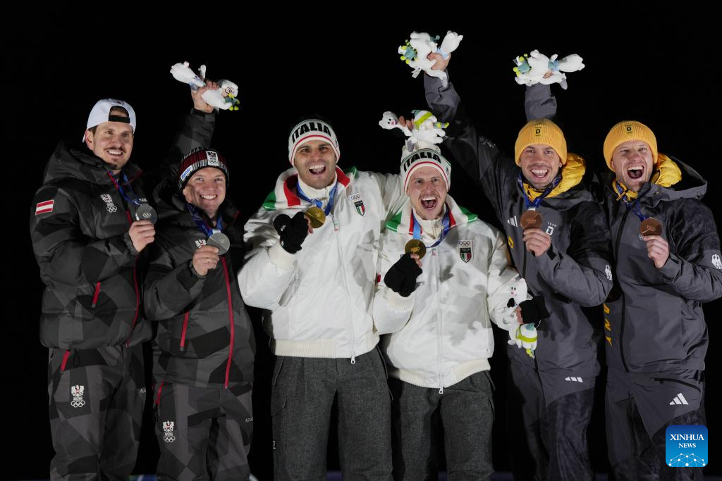 Gold medalists Emanuel Rieder/Simon Kainzwaldner (C) of Italy, silver medalists Thomas Steu/Wolfgang Kindl (L) of Austria, and bronze medalists Tobias Wendl/Tobias Arlt of Germany pose for a photo during the awarding ceremony of the luge men's doubles at the Milan-Cortina 2026 Olympic Winter Games in Cortina, Italy, Feb. 11, 2026. (Xinhua/Li Gang)