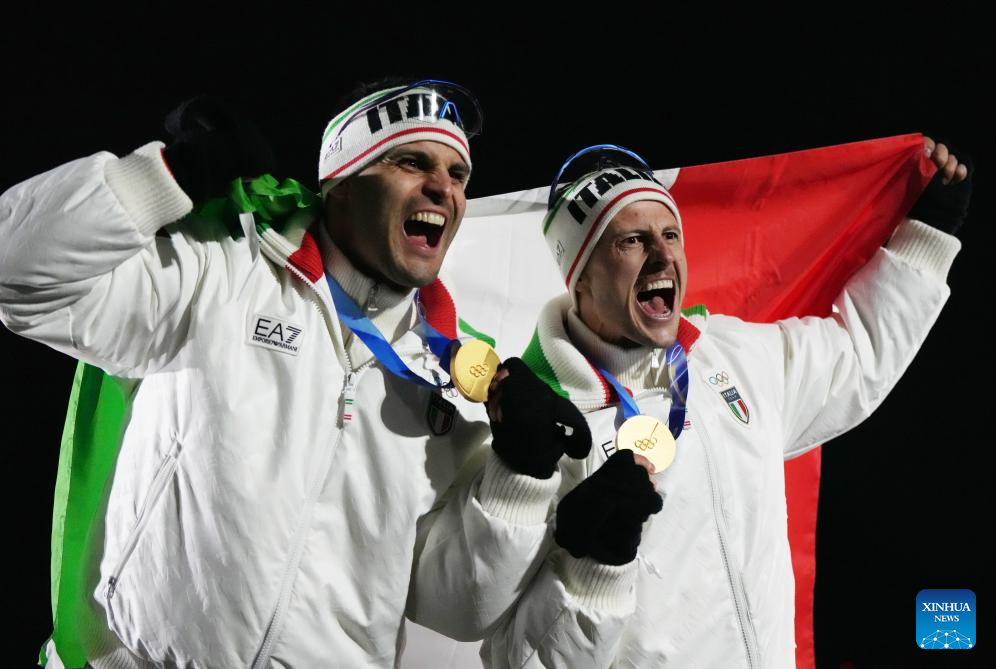 Gold medalists Emanuel Rieder/Simon Kainzwaldner of Italy celebrate during the awarding ceremony of the luge men's doubles at the Milan-Cortina 2026 Olympic Winter Games in Cortina, Italy, Feb. 11, 2026. (Xinhua/Li Gang)