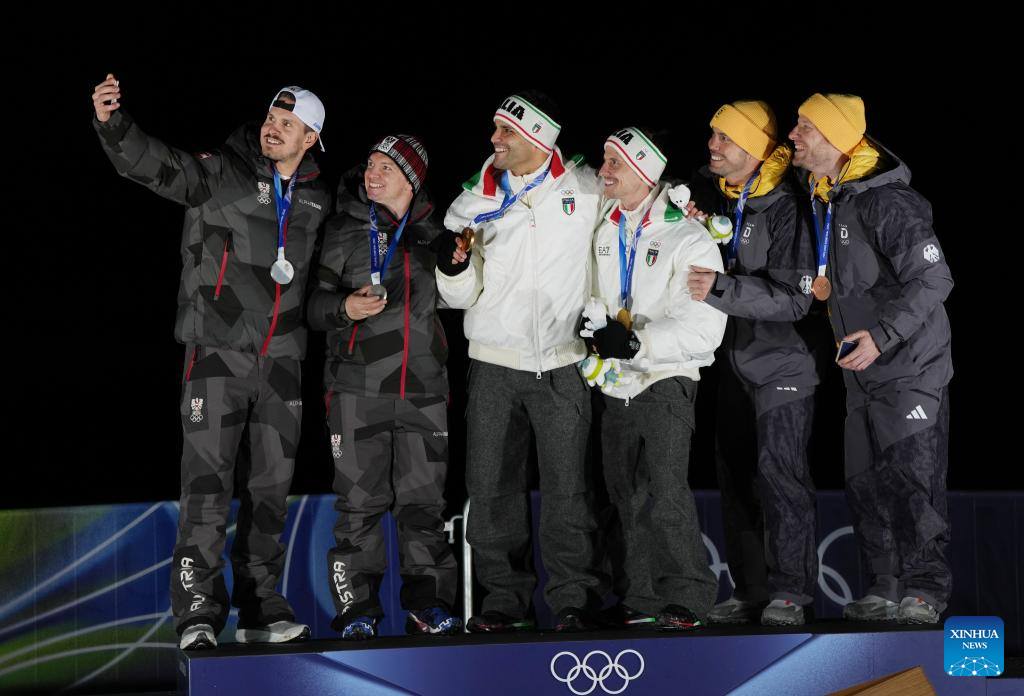 Gold medalists Emanuel Rieder/Simon Kainzwaldner (C) of Italy, silver medalists Thomas Steu/Wolfgang Kindl (L) of Austria, and bronze medalists Tobias Wendl/Tobias Arlt of Germany take a selfie during the awarding ceremony of the luge men's doubles at the Milan-Cortina 2026 Olympic Winter Games in Cortina, Italy, Feb. 11, 2026. (Xinhua/Li Gang)