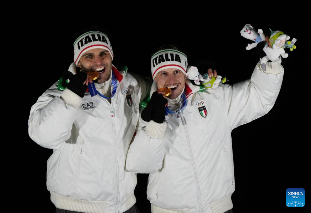 Gold medalists Emanuel Rieder/Simon Kainzwaldner of Italy pose for a photo during the awarding ceremony of the luge men's doubles at the Milan-Cortina 2026 Olympic Winter Games in Cortina, Italy, Feb. 11, 2026. (Xinhua/Li Gang)