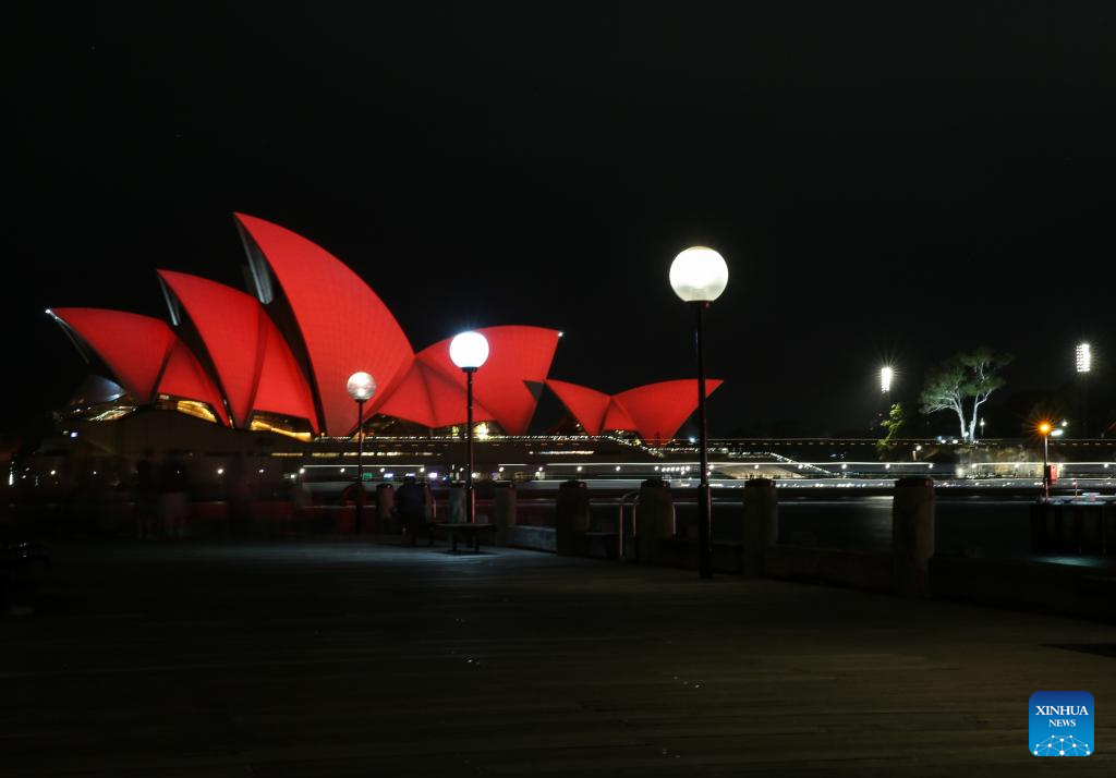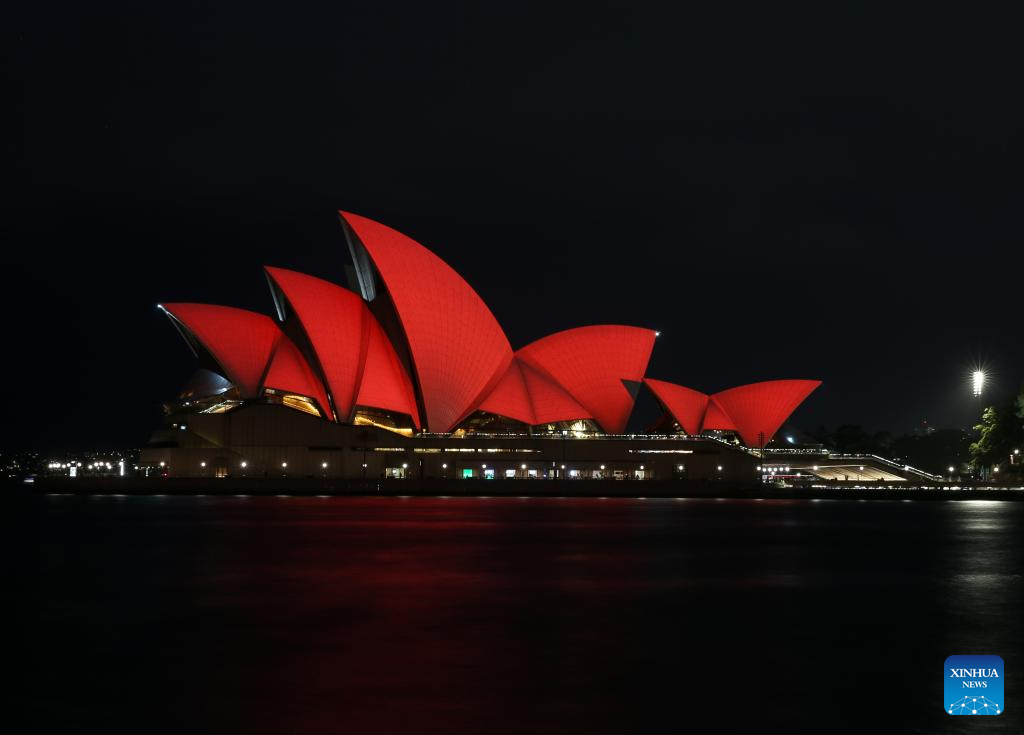 This photo taken on Feb. 12, 2026 shows the Opera House lit up in red to celebrate the upcoming Chinese New Year in Sydney, Australia. (Xinhua/Ma Ping)