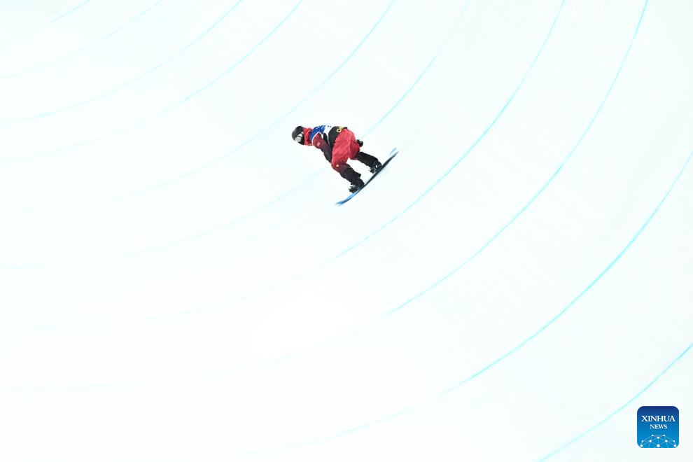 Ren Chongshuo of China competes during the men's snowboard halfpipe qualification at the Milan-Cortina 2026 Olympic Winter Games in Livigno, Italy, Feb. 11, 2026. (Xinhua/Zhang Hongxiang)