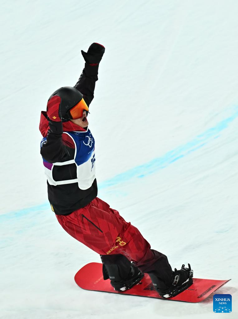Wang Ziyang of China celebrates during the men's snowboard halfpipe qualification at the Milan-Cortina 2026 Olympic Winter Games in Livigno, Italy, Feb. 11, 2026. (Xinhua/Zhang Hongxiang)
