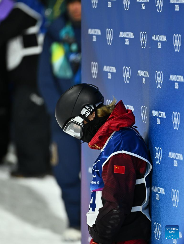 Ren Chongshuo of China reacts after the men's snowboard halfpipe qualification at the Milan-Cortina 2026 Olympic Winter Games in Livigno, Italy, Feb. 11, 2026. (Xinhua/Zhang Hongxiang)