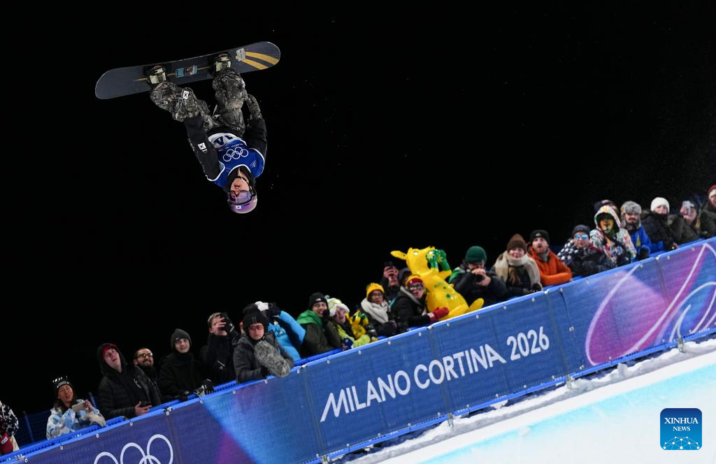 Lee Jio of South Korea competes during the men's snowboard halfpipe qualification at the Milan-Cortina 2026 Olympic Winter Games in Livigno, Italy, Feb. 11, 2026. (Xinhua/Wu Huiwo)