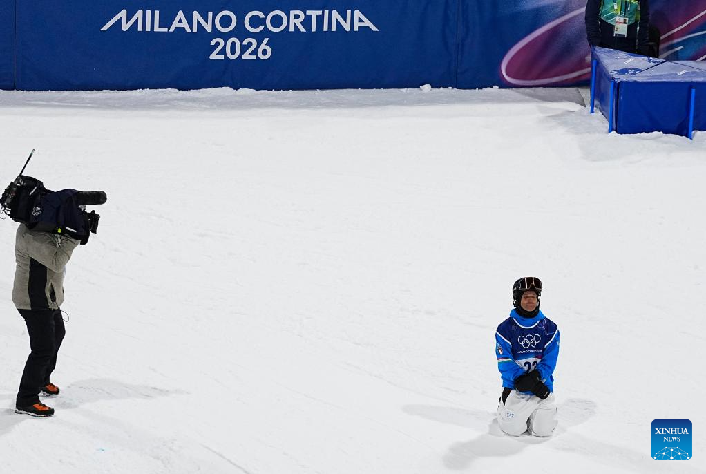 Valentino Guseli of Australia reacts during the men's snowboard halfpipe qualification at the Milan-Cortina 2026 Olympic Winter Games in Livigno, Italy, Feb. 11, 2026. (Xinhua/Zhang Hongxiang)