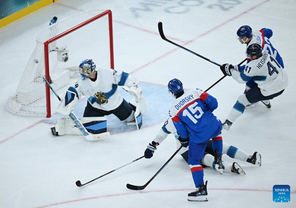 Slovakia's Adam Ruzicka (2nd R) scores during the ice hockey men's preliminary round group B match between Finland and Slovakia at the Milan-Cortina 2026 Olympic Winter Games in Milan, Italy, Feb. 11, 2026. (Xinhua/Zhang Haofu)
