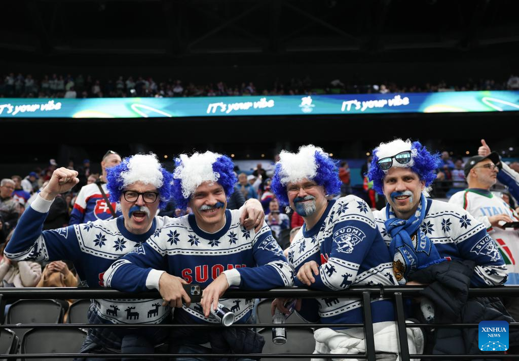 Fans of Finland pose before the ice hockey men's preliminary round group B match between Finland and Slovakia at the Milan-Cortina 2026 Olympic Winter Games in Milan, Italy, Feb. 11, 2026. (Xinhua/Wang Kaiyan)