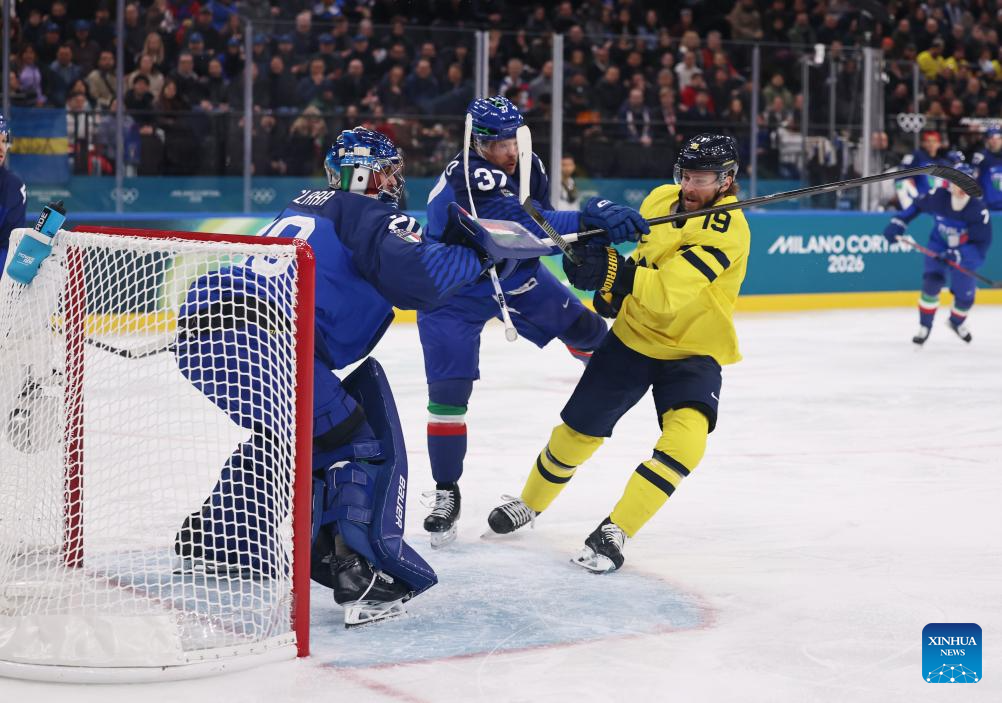 Mika Zibanejad (L) of Sweden shoots during the ice hockey men's preliminary round group B match between Italy and Sweden at the Milan-Cortina 2026 Olympic Winter Games in Milan, Italy, Feb. 11, 2026. (Xinhua/Zhang Haofu)