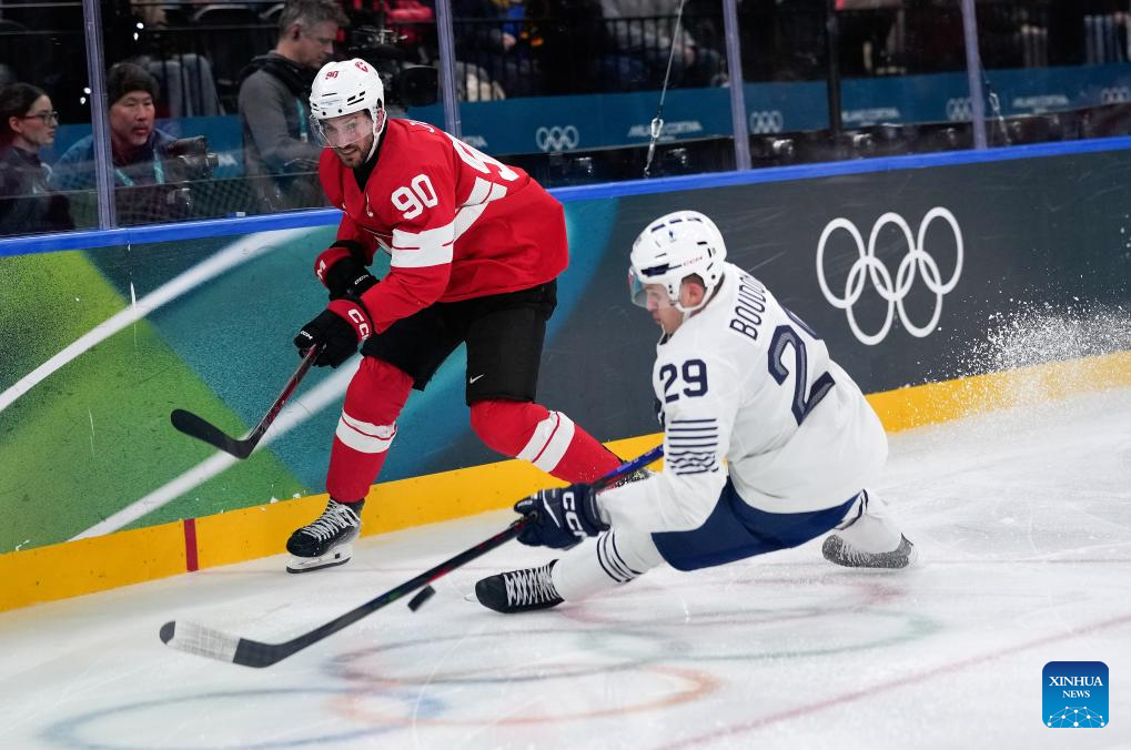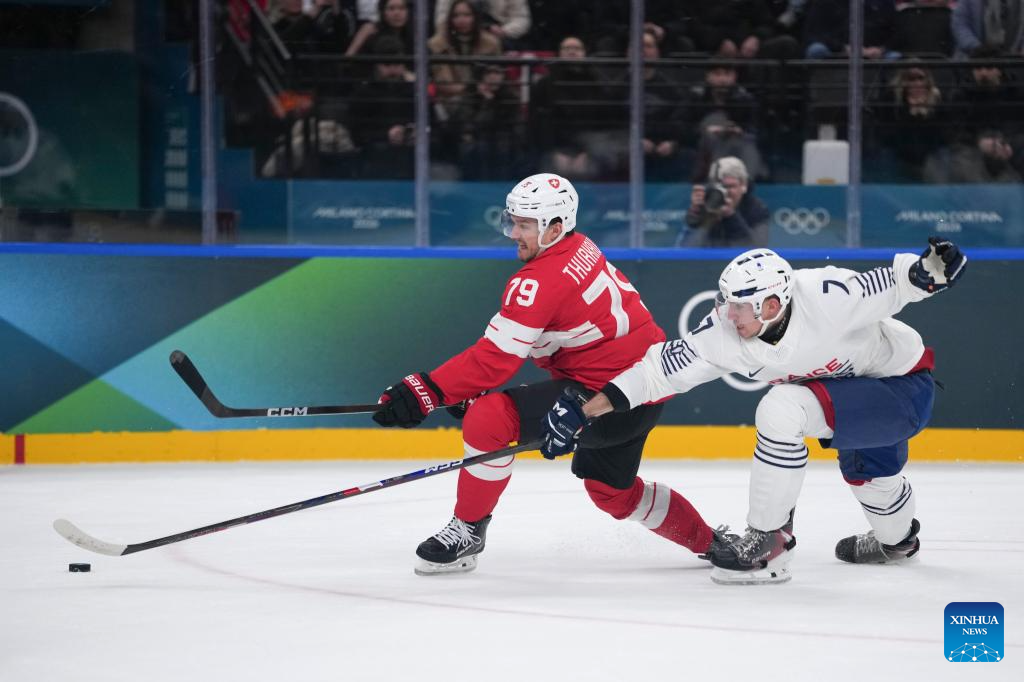 Calvin Thurkauf (L) of Switzerland competes with Pierre Crinon of France during the ice hockey men's preliminary round group A match between Switzerland and France at the Milan-Cortina 2026 Olympic Winter Games in Milan, Italy, Feb. 12, 2026. (Xinhua/Tao Xiyi)