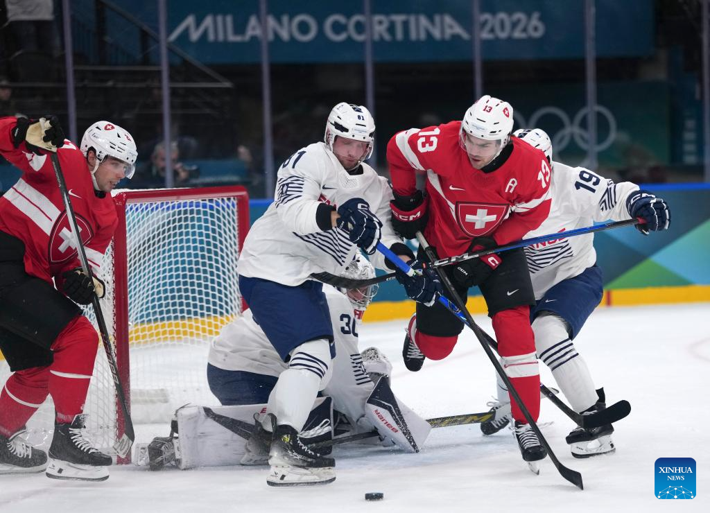 Nico Hischier (2nd R) of Switzerland breaks through during the ice hockey men's preliminary round group A match between Switzerland and France at the Milan-Cortina 2026 Olympic Winter Games in Milan, Italy, Feb. 12, 2026. (Xinhua/Tao Xiyi)