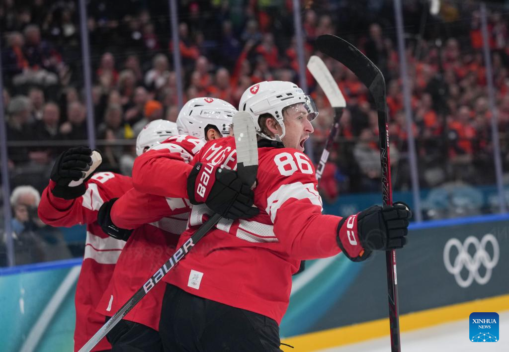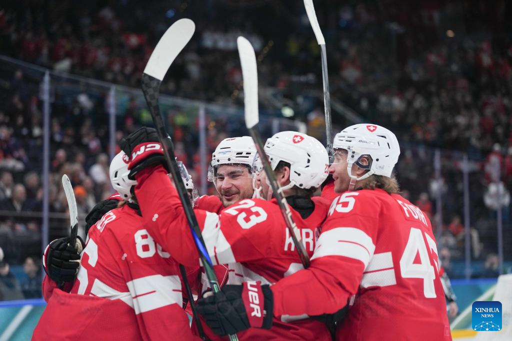 Players of Switzerland celebrate during the ice hockey men's preliminary round group A match between Switzerland and France at the Milan-Cortina 2026 Olympic Winter Games in Milan, Italy, Feb. 12, 2026. (Xinhua/Tao Xiyi)