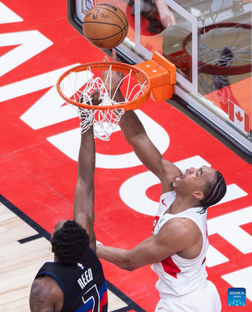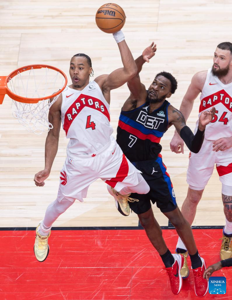 Scottie Barnes (L) of Toronto Raptors dunks during the 2025-2026 NBA regular season game between Toronto Raptors and Detroit Pistons in Toronto, Canada, Feb. 11, 2026. (Photo by Zou Zheng/Xinhua)