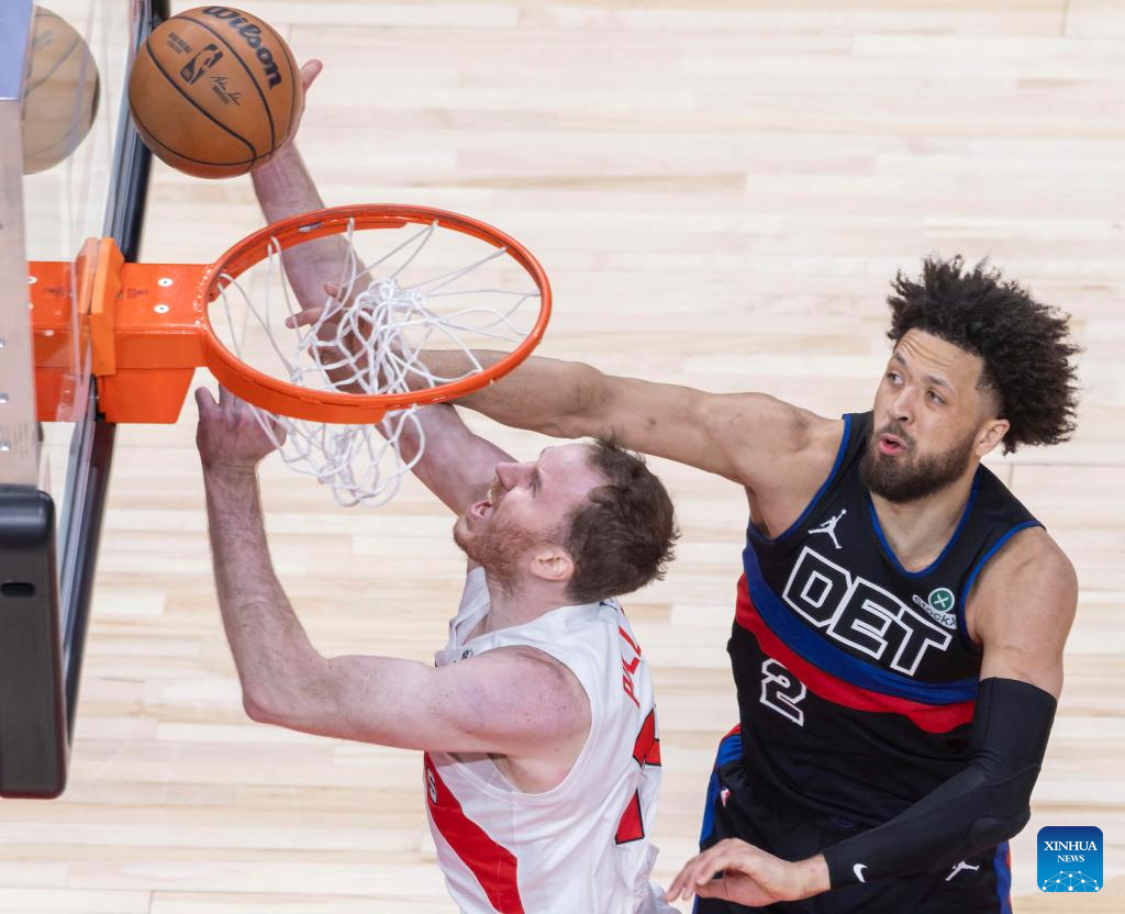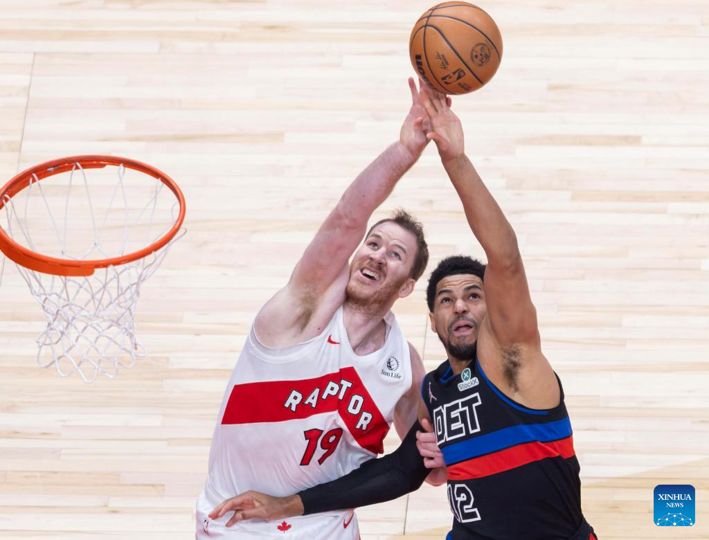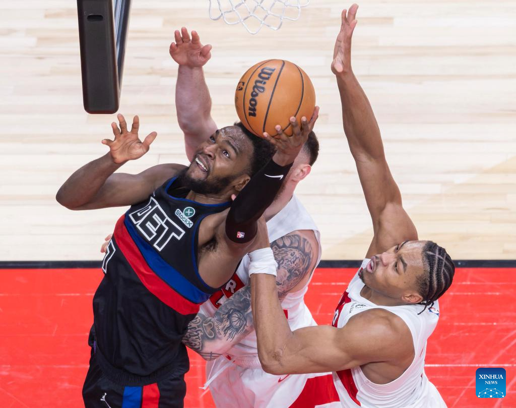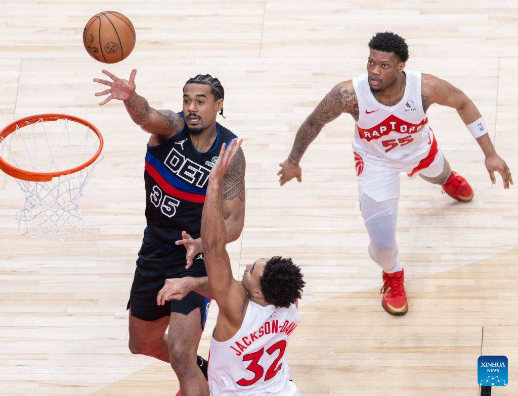 Tolu Smith III (L) of Detroit Pistons goes up for a layup during the 2025-2026 NBA regular season game between Toronto Raptors and Detroit Pistons in Toronto, Canada, Feb. 11, 2026. (Photo by Zou Zheng/Xinhua)