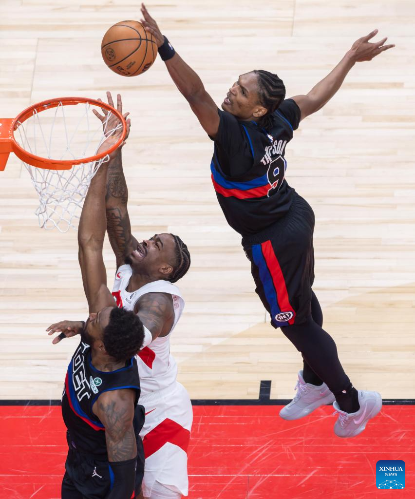 Ausar Thompson (R) of Detroit Pistons blocks Jamal Shead of Toronto Raptors during the 2025-2026 NBA regular season game between Toronto Raptors and Detroit Pistons in Toronto, Canada, Feb. 11, 2026. (Photo by Zou Zheng/Xinhua)