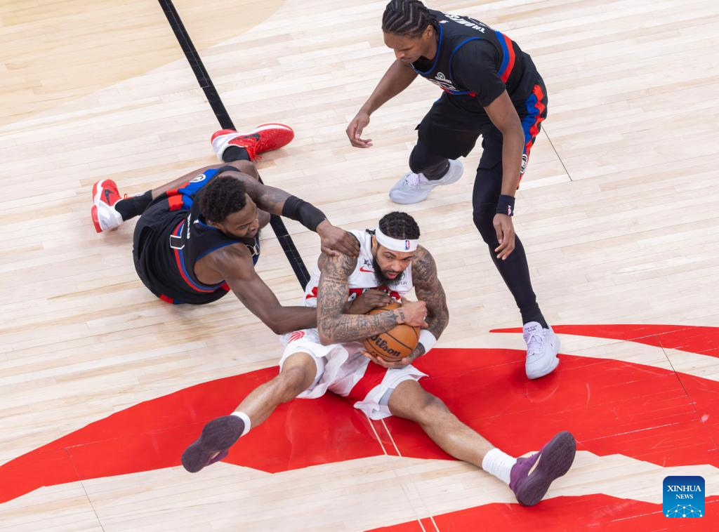 Jakob Poeltl (L) of Toronto Raptors fights for a rebound with Tobias Harris of Detroit Pistons during the 2025-2026 NBA regular season game between Toronto Raptors and Detroit Pistons in Toronto, Canada, Feb. 11, 2026. (Photo by Zou Zheng/Xinhua)
