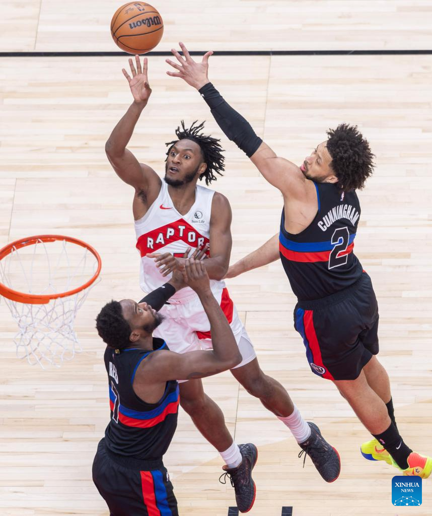 Paul Reed (L) of Detroit Pistons goes for a layup during the 2025-2026 NBA regular season game between Toronto Raptors and Detroit Pistons in Toronto, Canada, Feb. 11, 2026. (Photo by Zou Zheng/Xinhua)