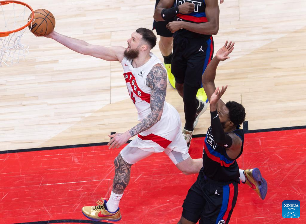 Jakob Poeltl (L) of Toronto Raptors goes for a layup during the 2025-2026 NBA regular season game between Toronto Raptors and Detroit Pistons in Toronto, Canada, Feb. 11, 2026. (Photo by Zou Zheng/Xinhua)