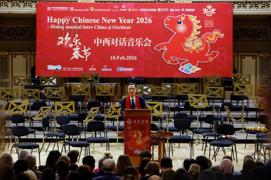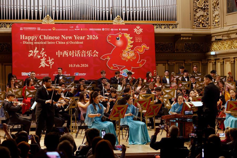 BUCHAREST, Feb. 12 (Xinhua) -- The air inside Bucharest's Athenaeum resonated with the silvery tones of silk strings and rich percussion on Tuesday evening, as traditional Chinese melodies met Romanian symphonic harmonies in a concert celebrating cultural dialogue and the upcoming Chinese New Year.