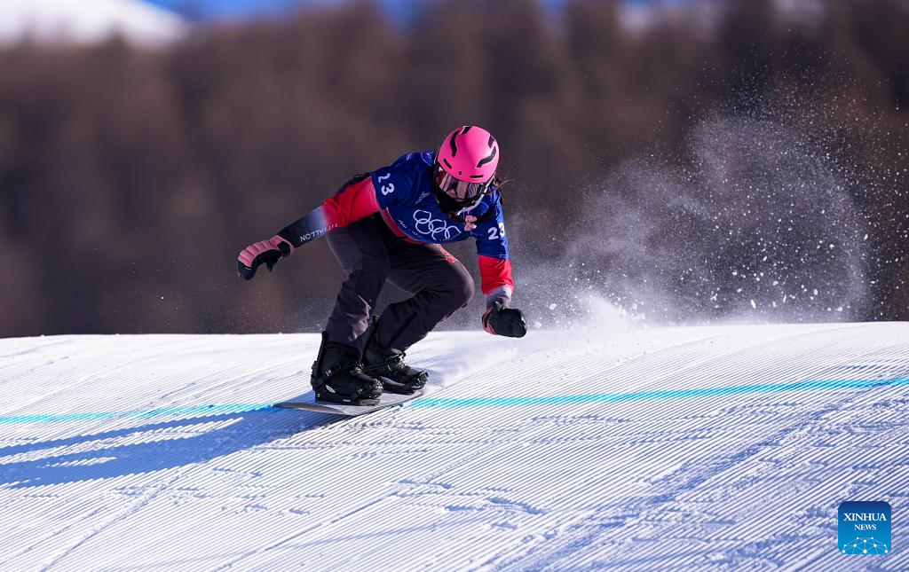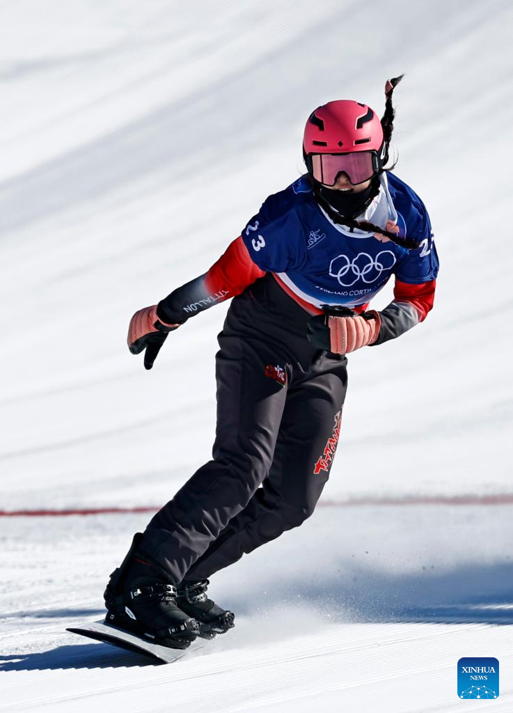 Pang Chuyuan of China competes during the snowboard women's cross seeding at the Milan-Cortina 2026 Olympic Winter Games in Livigno, Italy, Feb. 13, 2026. (Xinhua/Wang Peng)