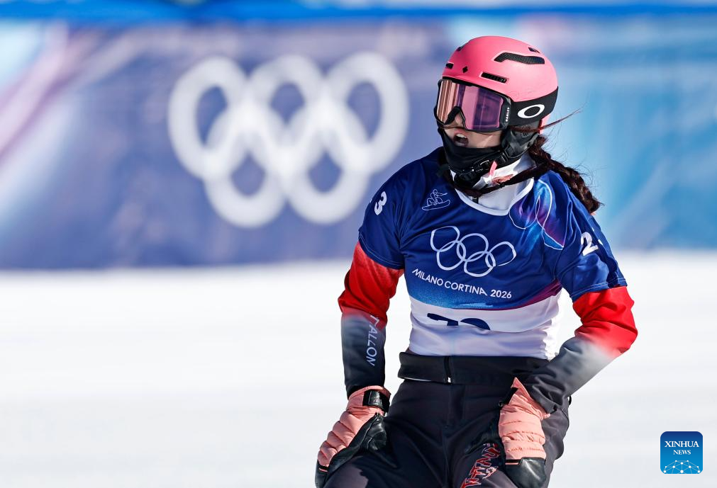 Yongqinglamu of China competes during the snowboard women's cross seeding at the Milan-Cortina 2026 Olympic Winter Games in Livigno, Italy, Feb. 13, 2026. (Xinhua/Wu Huiwo)