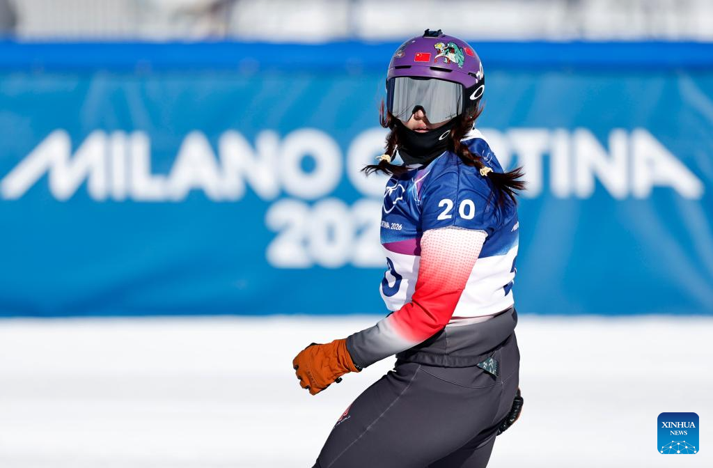 Pang Chuyuan of China competes during the snowboard women's cross seeding at the Milan-Cortina 2026 Olympic Winter Games in Livigno, Italy, Feb. 13, 2026. (Xinhua/Wu Huiwo)