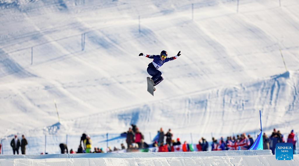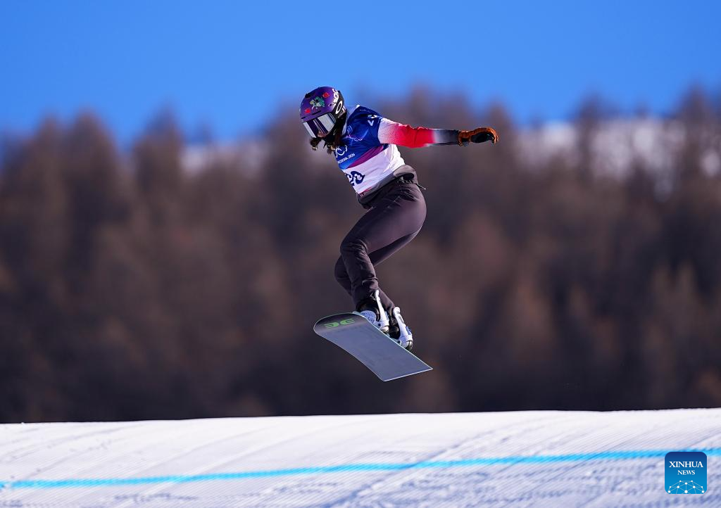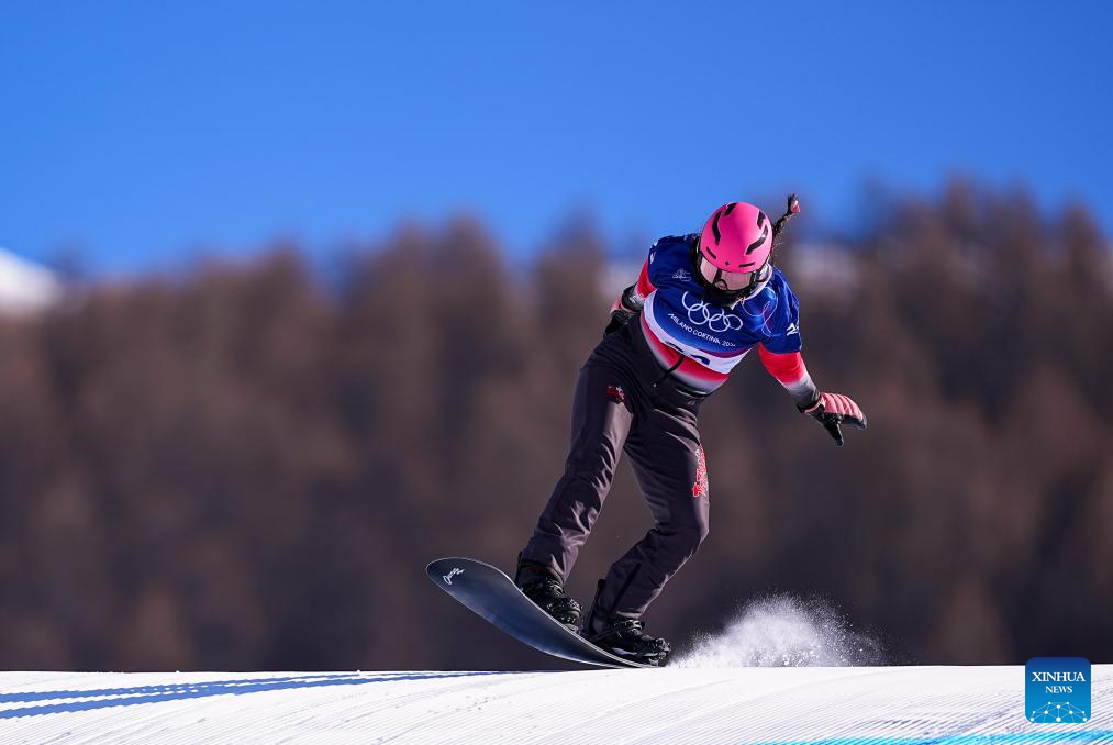 Yongqinglamu of China competes during the snowboard women's cross seeding at the Milan-Cortina 2026 Olympic Winter Games in Livigno, Italy, Feb. 13, 2026. (Xinhua/Wang Peng)